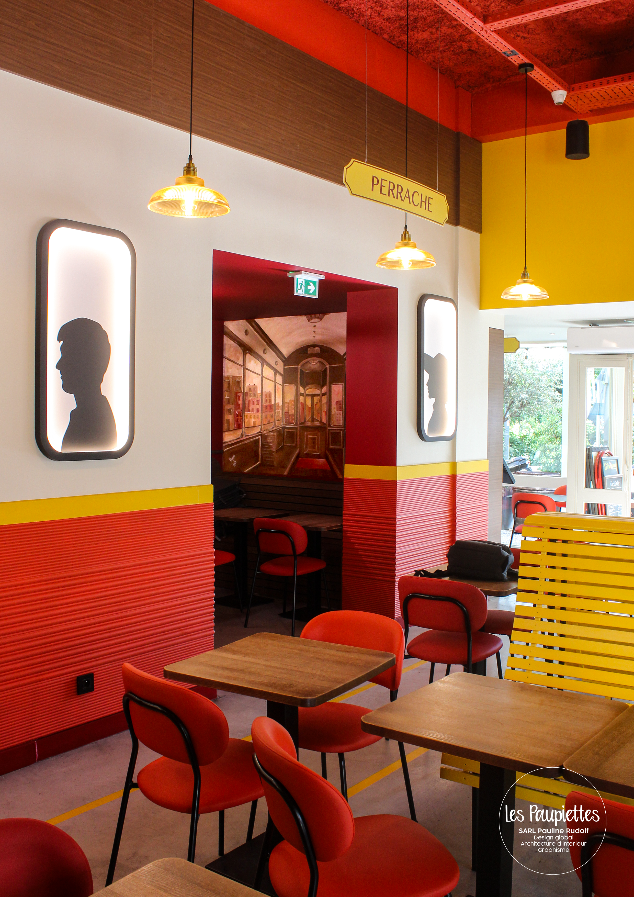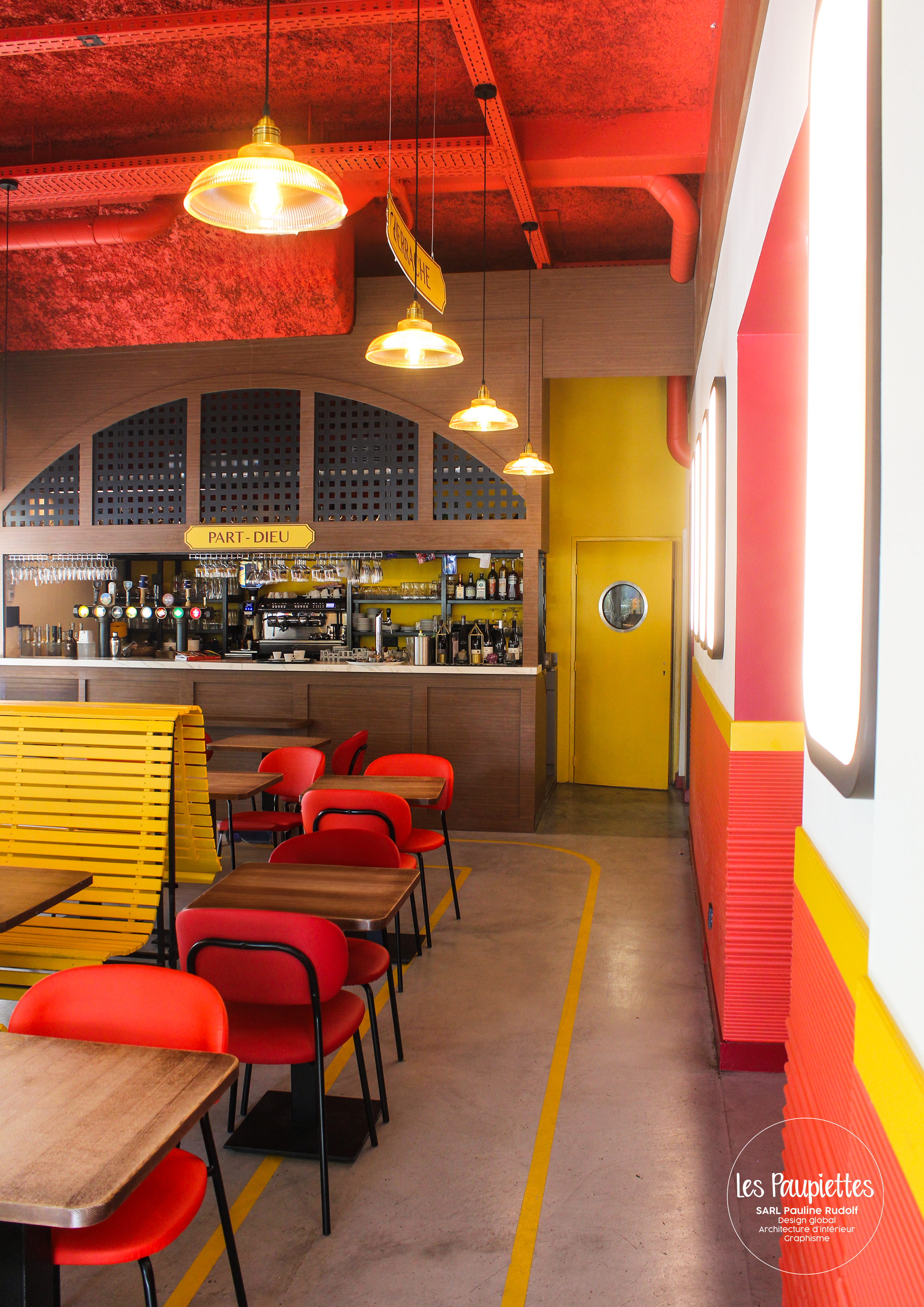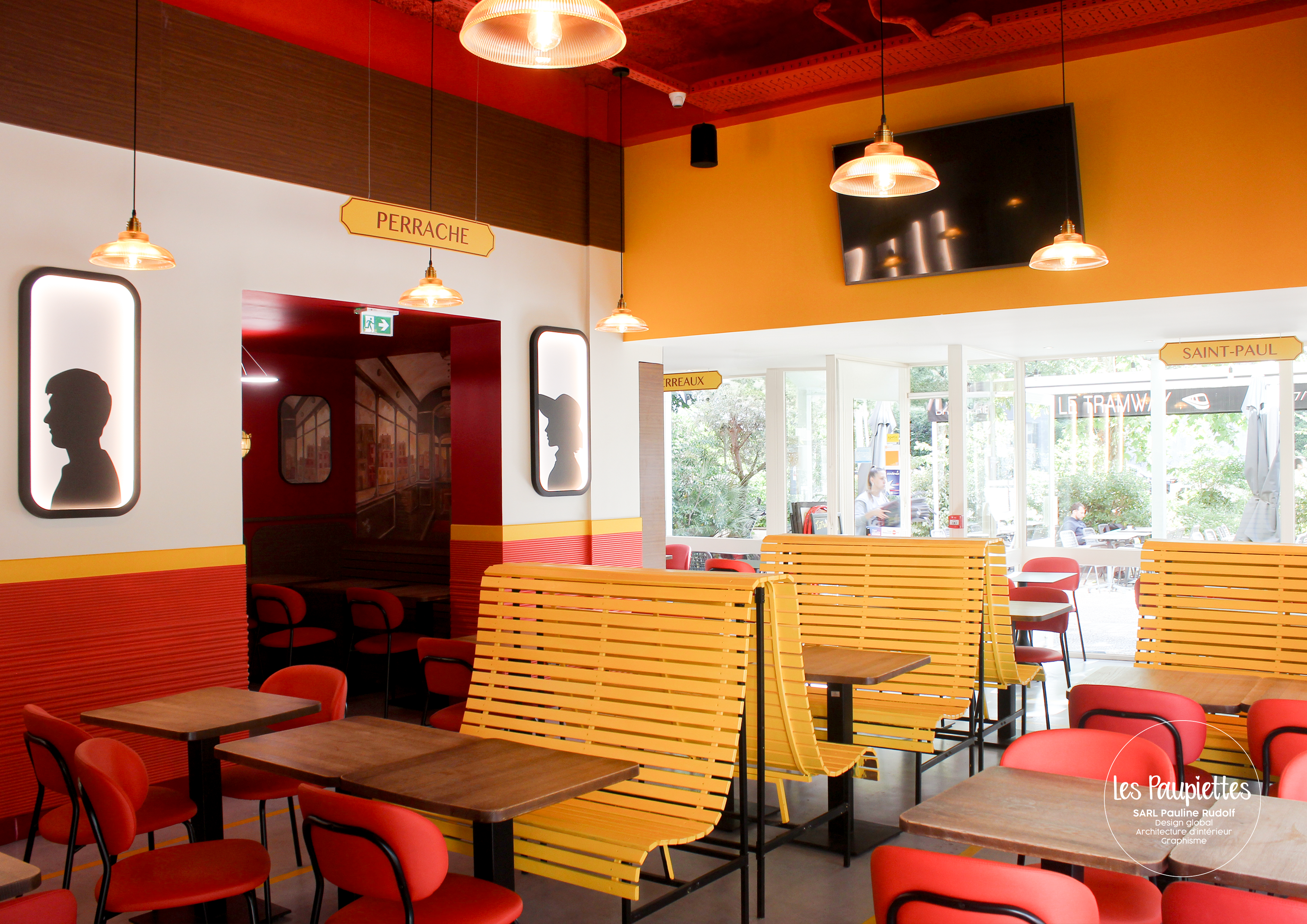 Intéressant projet d’apport d’agencement d’un bar restaurant autour de la thématique d’un tramway ancien, avec ses banquettes, ses façades murales, ses chaises, ses tables et son bar en bois mélaminé noyer.