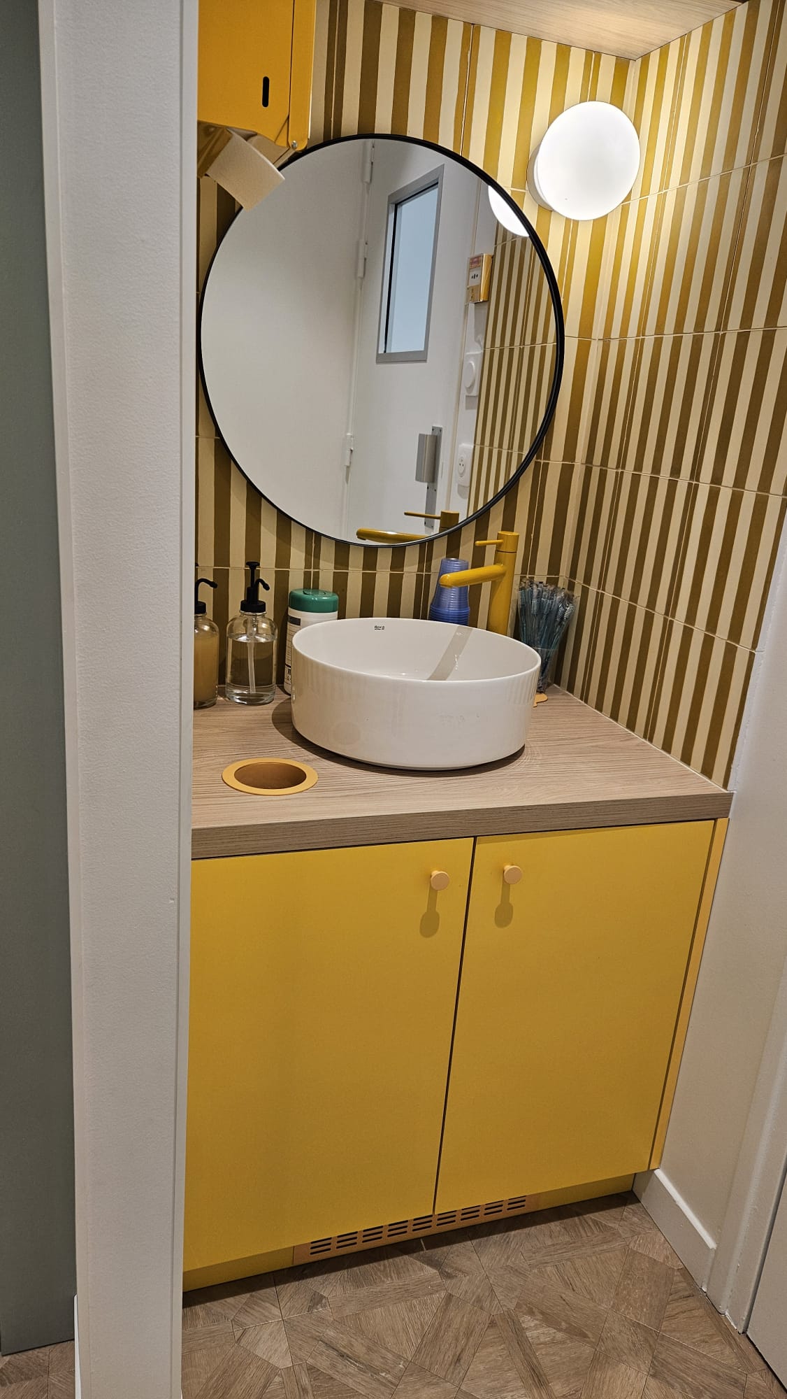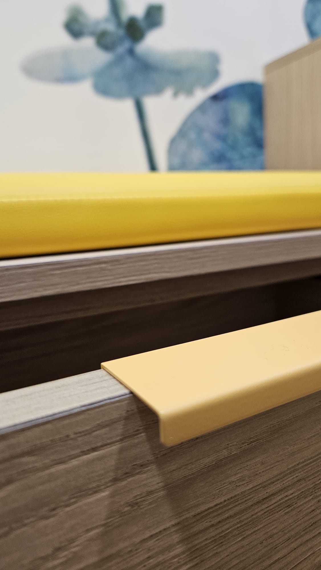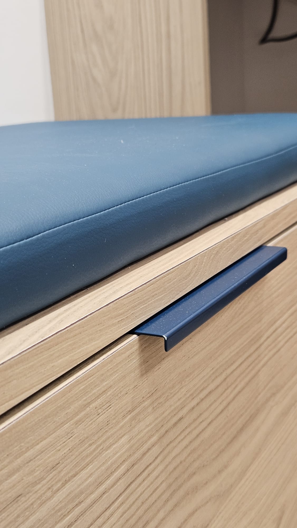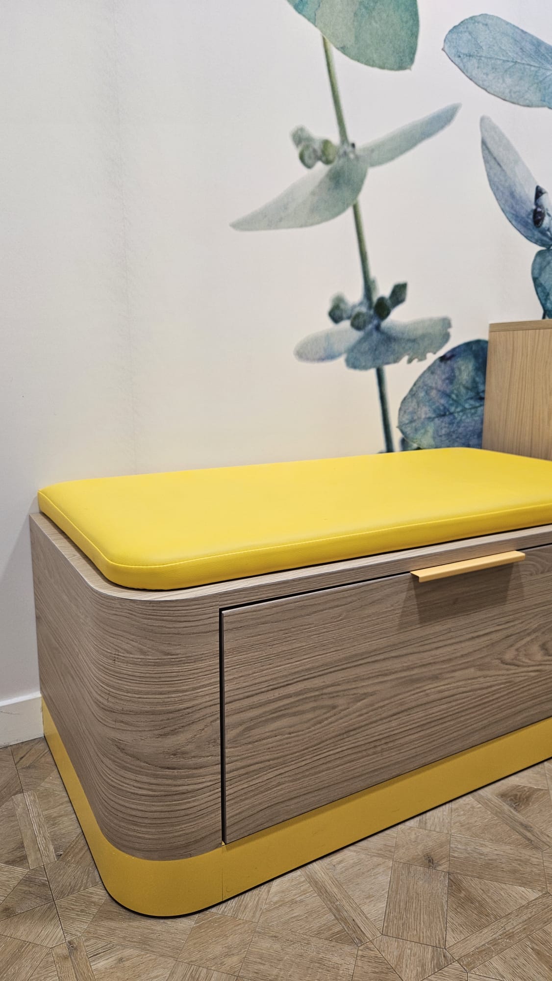 Notre donneur d’ordre, un cabinet d’architectes basé à Rilleux (Rhône), voulait un univers pastel autour de 3 couleurs, un bleu pétrol, un jaune gouache, et un vert d’eau, le tout assorti avec un chêne Casella naturel.