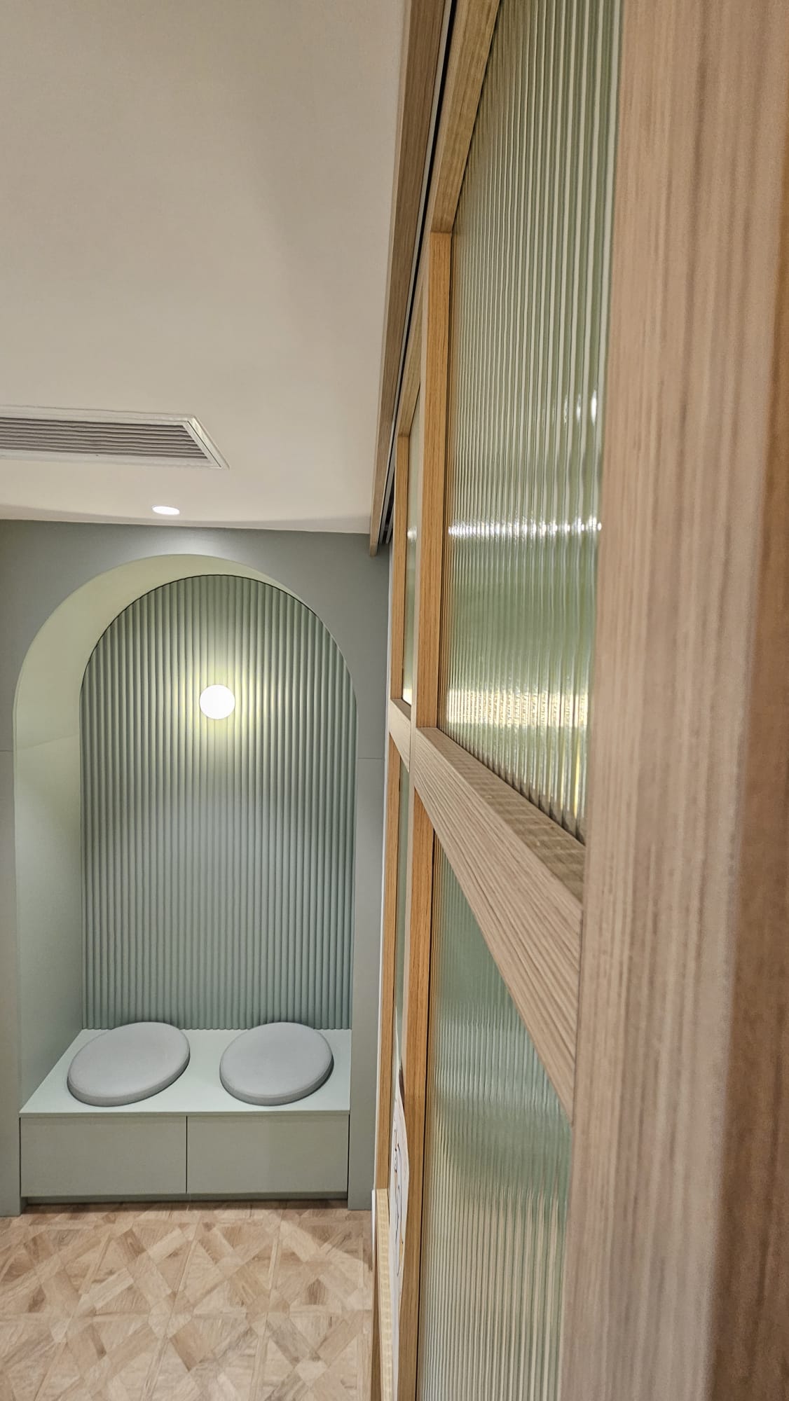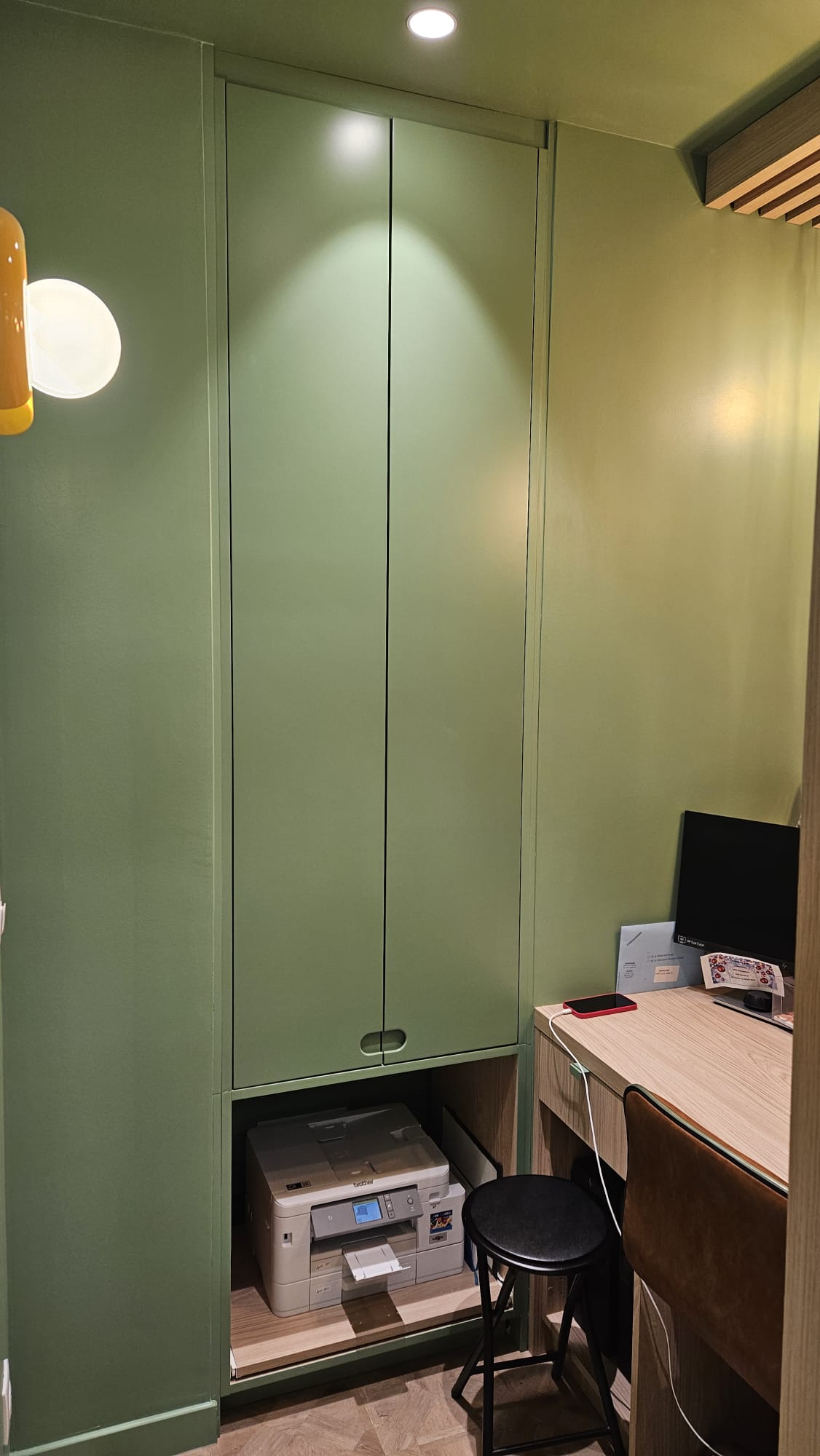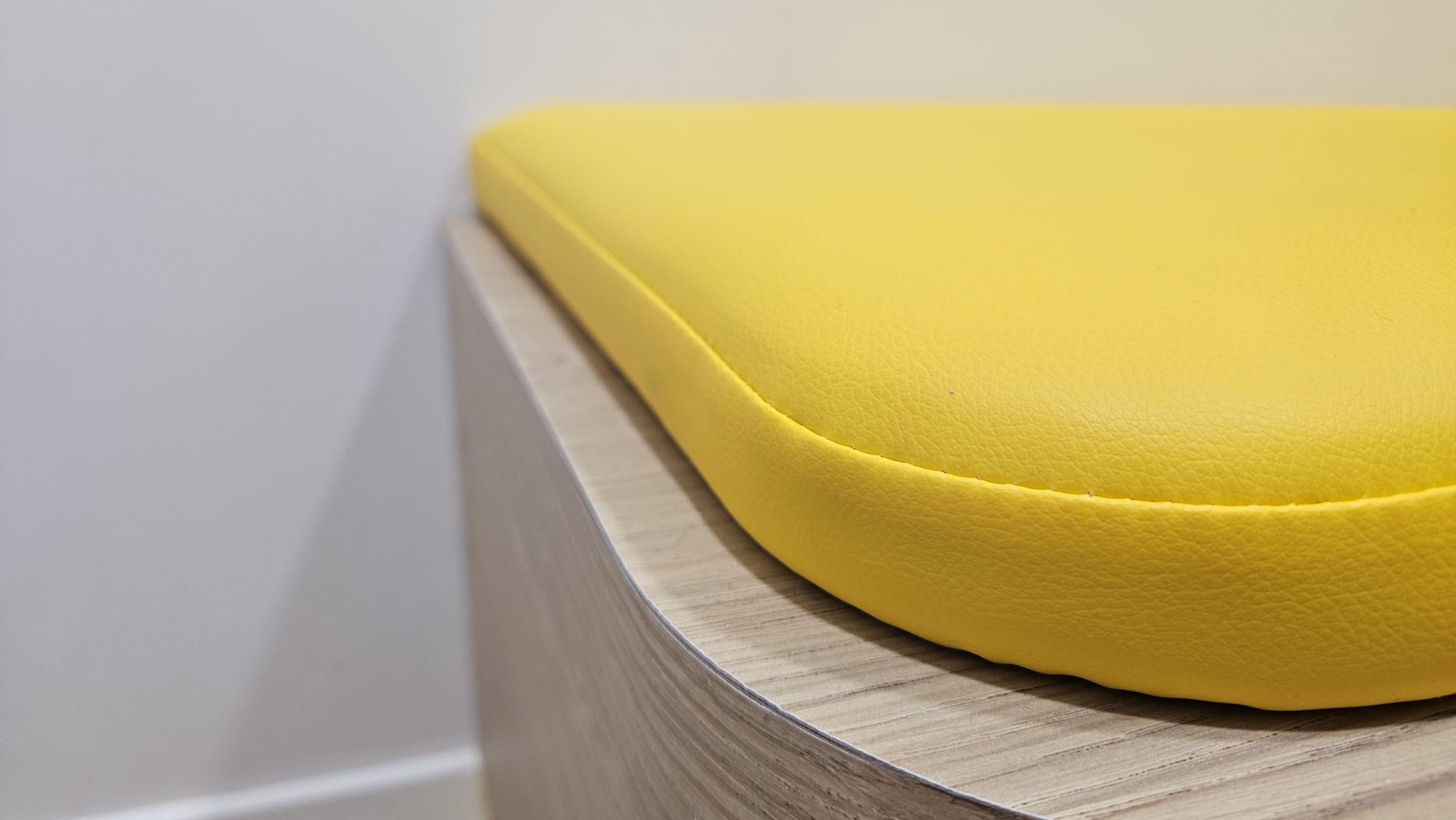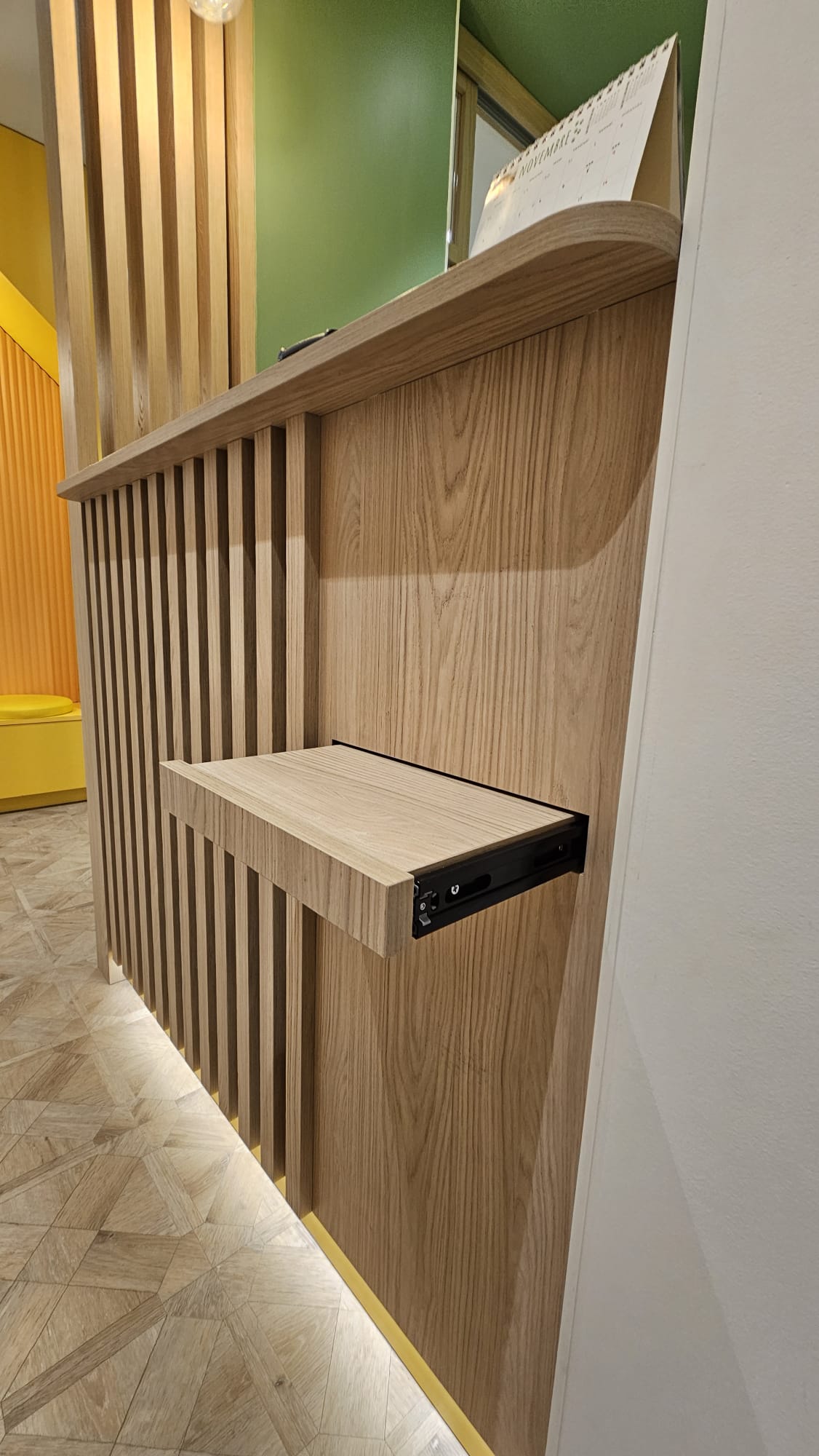 Notre donneur d’ordre, un cabinet d’architectes basé à Rilleux (Rhône), voulait un univers pastel autour de 3 couleurs, un bleu pétrol, un jaune gouache, et un vert d’eau, le tout assorti avec un chêne Casella naturel.